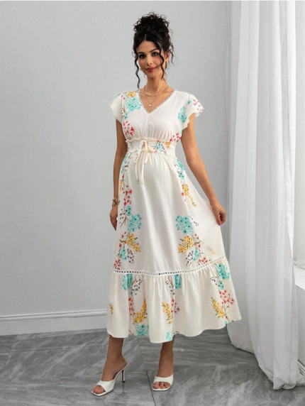 Momance فستان حوامل طباعة زهور رقبة على شكل V أكمام قصيرة ربطة خصر