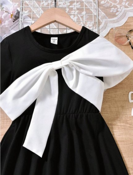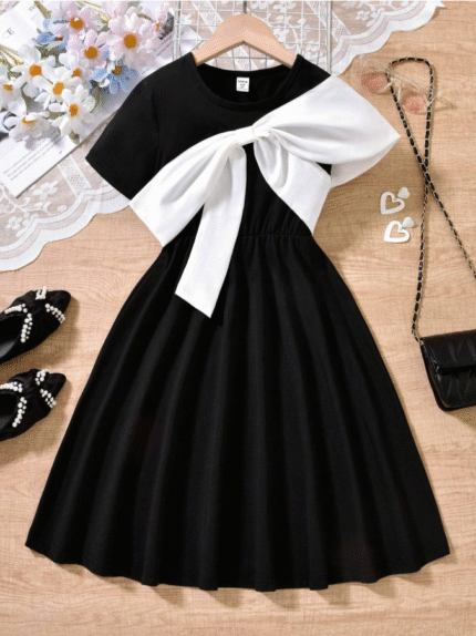 Glamorique Kids فستان فتاة صغيرة أنيق متناقض الألوان، ذو قصة بفتحات وحزام في شكل فراشة ثلاثي الأبعاد