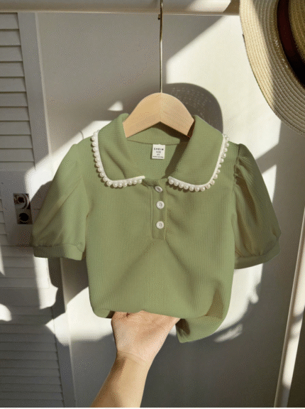 تيشرت قصير الأكمام ذو تصميم أنيق بياقة بيتر بان وأكمام منتفخة للفتاة الصغيرة، أنيق وجذاب، للصيف