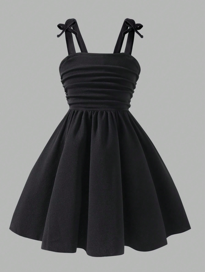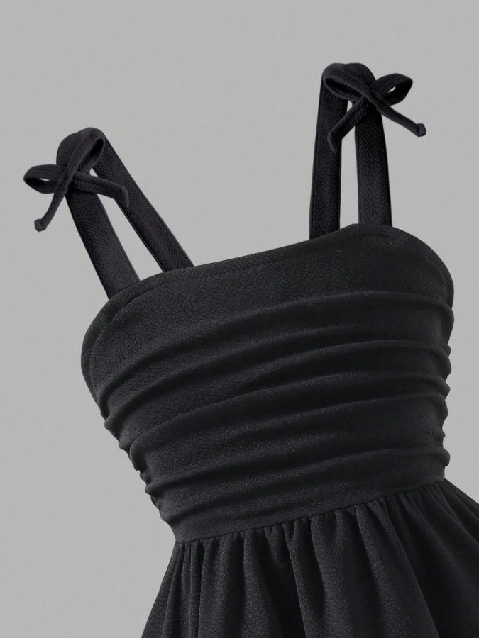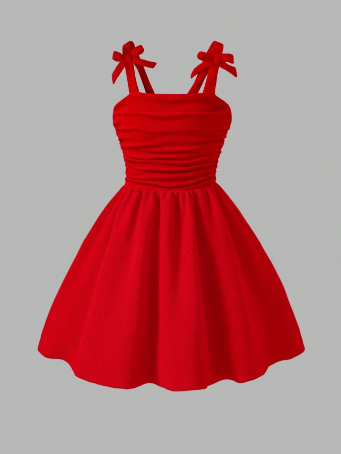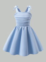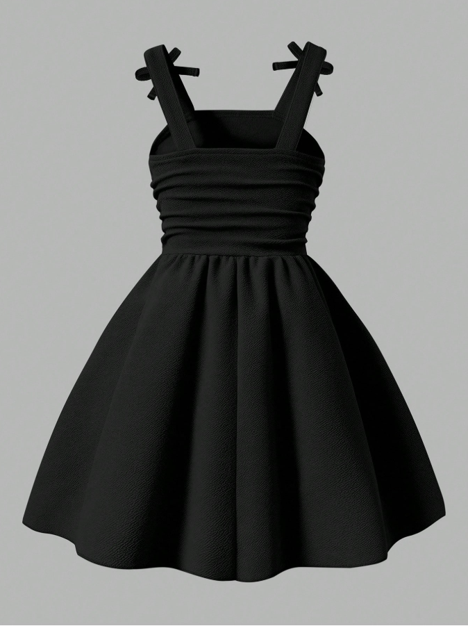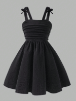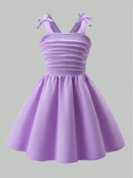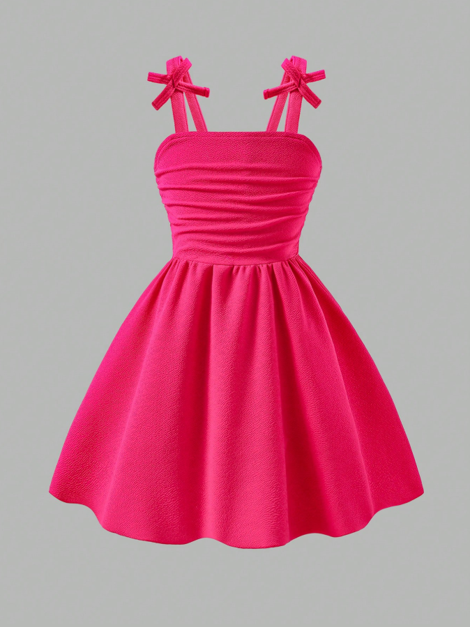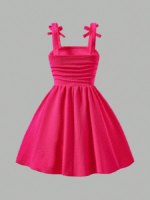 فستان الحفلات الأنيق ذو اللون الأحادي والشريط المجعد على الكتف بشكل 3D مناسب للحفلات الشاي، تشكيلة جديدة لربيع/صيف مناسبة للحفلات والتجمعات، للبنات الصغيرات