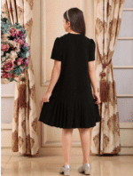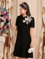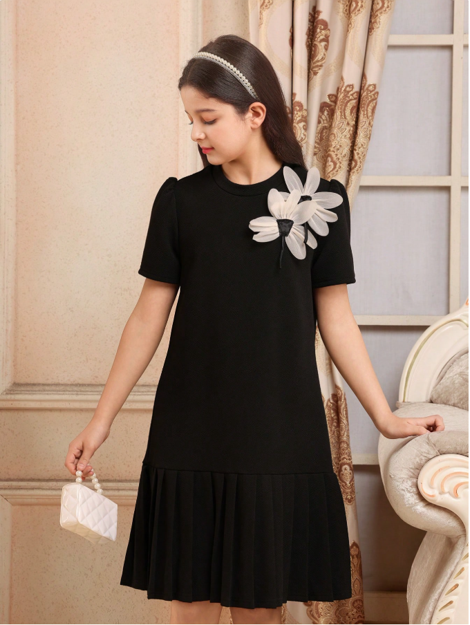 فستان بنات مراهقات أسود أكمام قصيرة متوسط الطول، قماش شبكي مطرز بنقشات زهور معقودة، قصة فضفاضة، ملائم للخروجات والمدرسة والحفلات، مناسب للربيع والصيف، عيد ميلاد