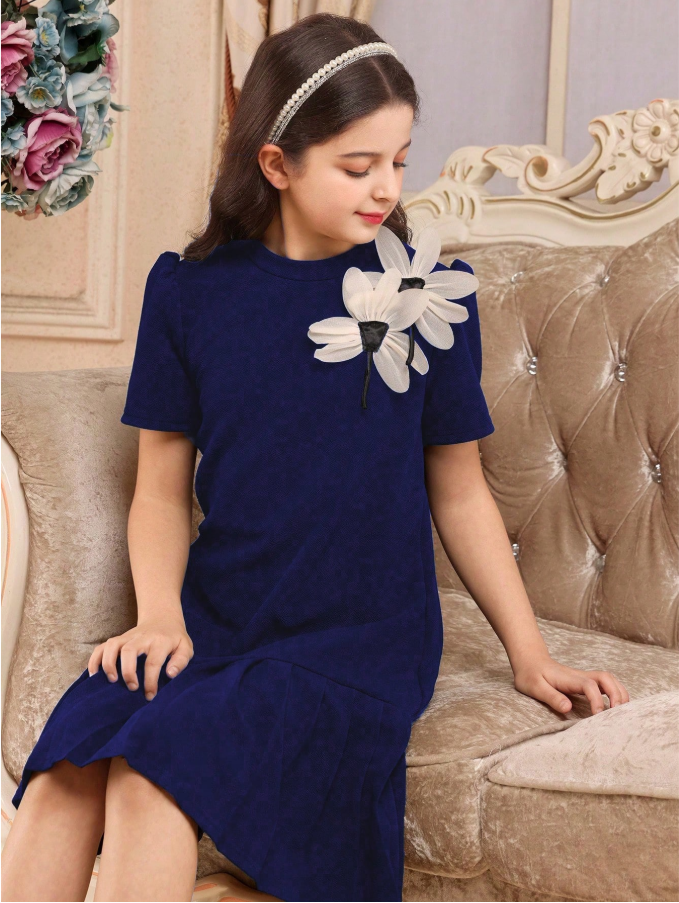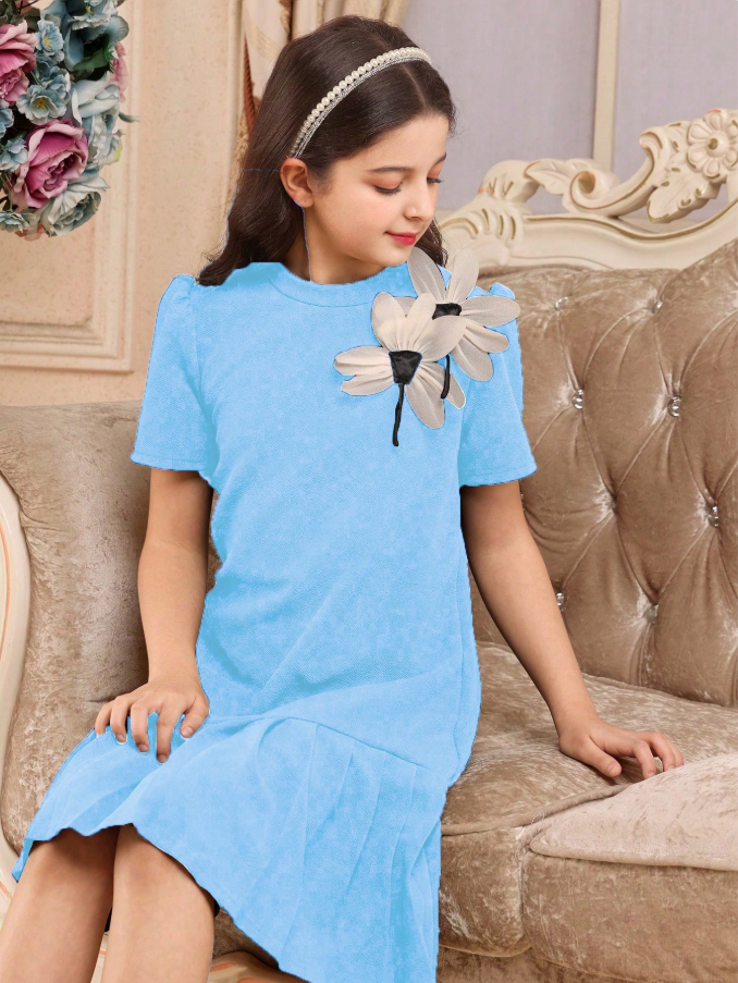 فستان الحفلات الأنيق ذو اللون الأحادي والشريط المجعد على الكتف بشكل 3D مناسب للحفلات الشاي، تشكيلة جديدة لربيع/صيف مناسبة للحفلات والتجمعات، للبنات الصغيرات