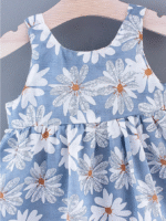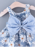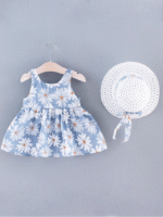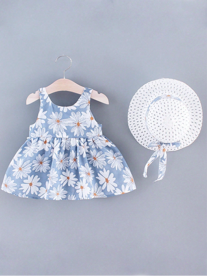 فستان فتاة صغيرة مطبوع عليه دوار الشمس بلا أكمام للصيف برباط خلفي جذاب و قبعة – مجموعة 2 قطعة