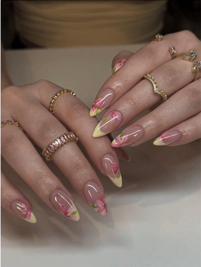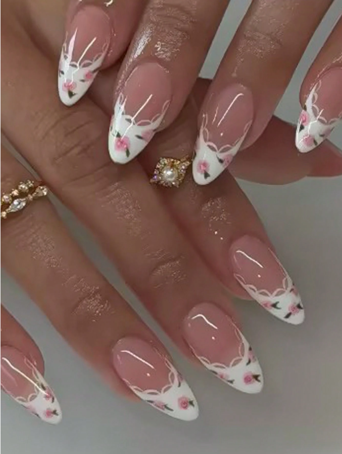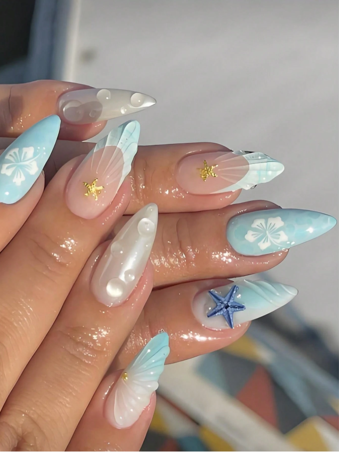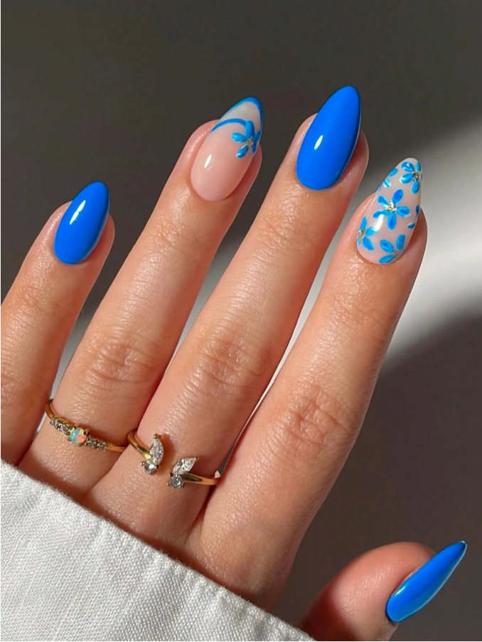 24 قطعة أظافر مستديرة متوسطة تركيب مباشر، أظافر بتصميم فرنسي باللون الأزرق و تصميم أزهار وخطوط أنيقة، تغطية كاملة مناسبة للنساء والفتيات للاستخدام اليومي في الصيف