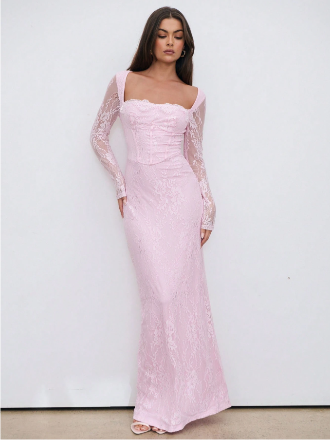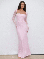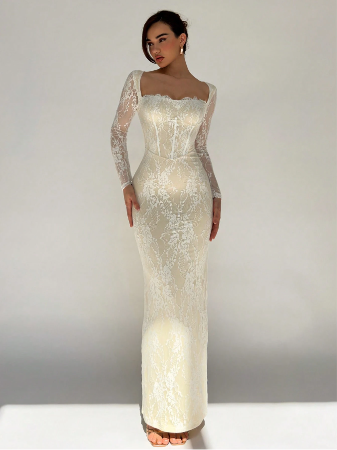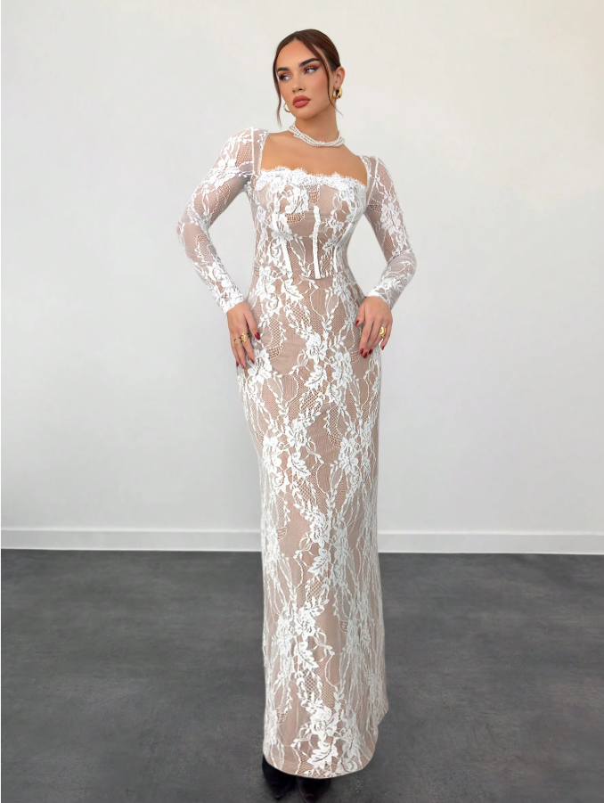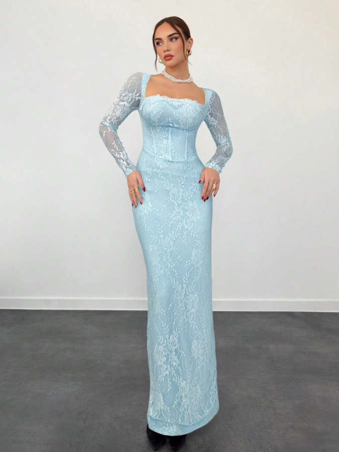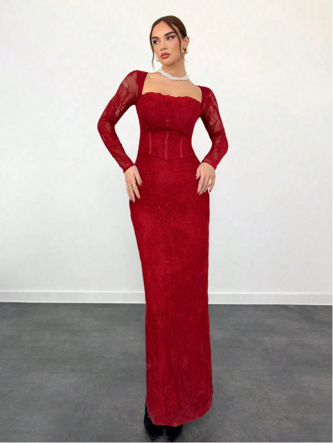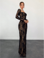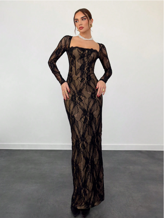 Aloruh فستان سهرة طويل وضيق للنساء، لشكل S بأكمام طويلة مطرز بالدانتيل، ذو فتحة على الرقبة مربعة، للمناسبات والسهرات و المواعيد، باللون الأسود، لفصلي الخريف والشتاء