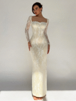 Siren Gaze فستان أنيق للزفاف بأكمام طويلة وقبة غير متماثلة مصنوع من لون أحادي ومرقع بشبك