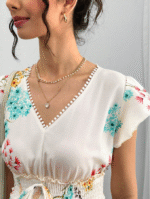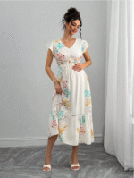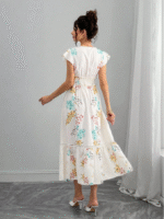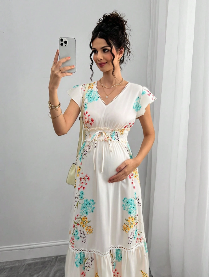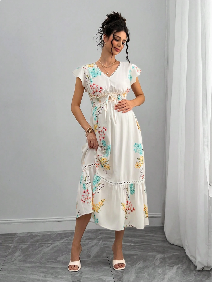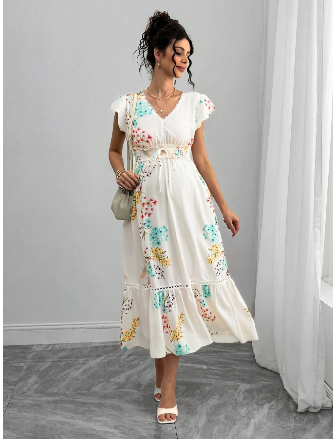 Momance فستان حوامل طباعة زهور رقبة على شكل V أكمام قصيرة ربطة خصر